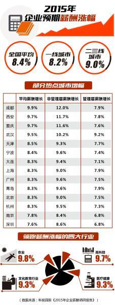 《2015年企業(yè)薪酬調研報告》顯示,二三線城市企業(yè)預期薪酬漲幅9.0%,高于一線城市的8.2%