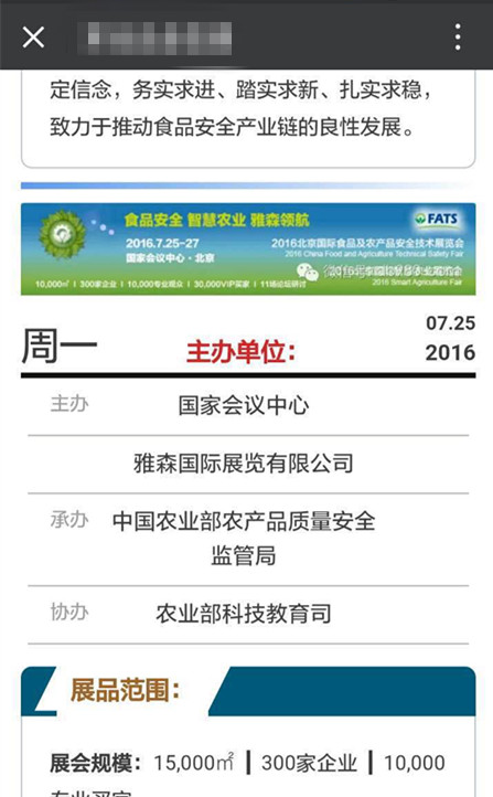 主觀的將“中國(guó)農(nóng)業(yè)部農(nóng)產(chǎn)品質(zhì)量安全監(jiān)管局”、”農(nóng)業(yè)部科技教育司”這樣的國(guó)家機(jī)關(guān)單位安排為承辦單位和協(xié)辦單位,將不實(shí)信息寫入展會(huì)介紹。